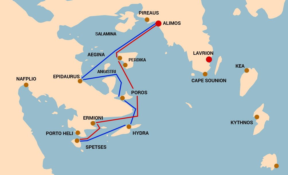 Плаване по маршрут: Атина – Порос– Хидра– Порто Хели – Егина– Атина. Маршрутът подлежи на промени в зависимост от метеорологичните условия, навигационната обстановка и други обективни фактори.